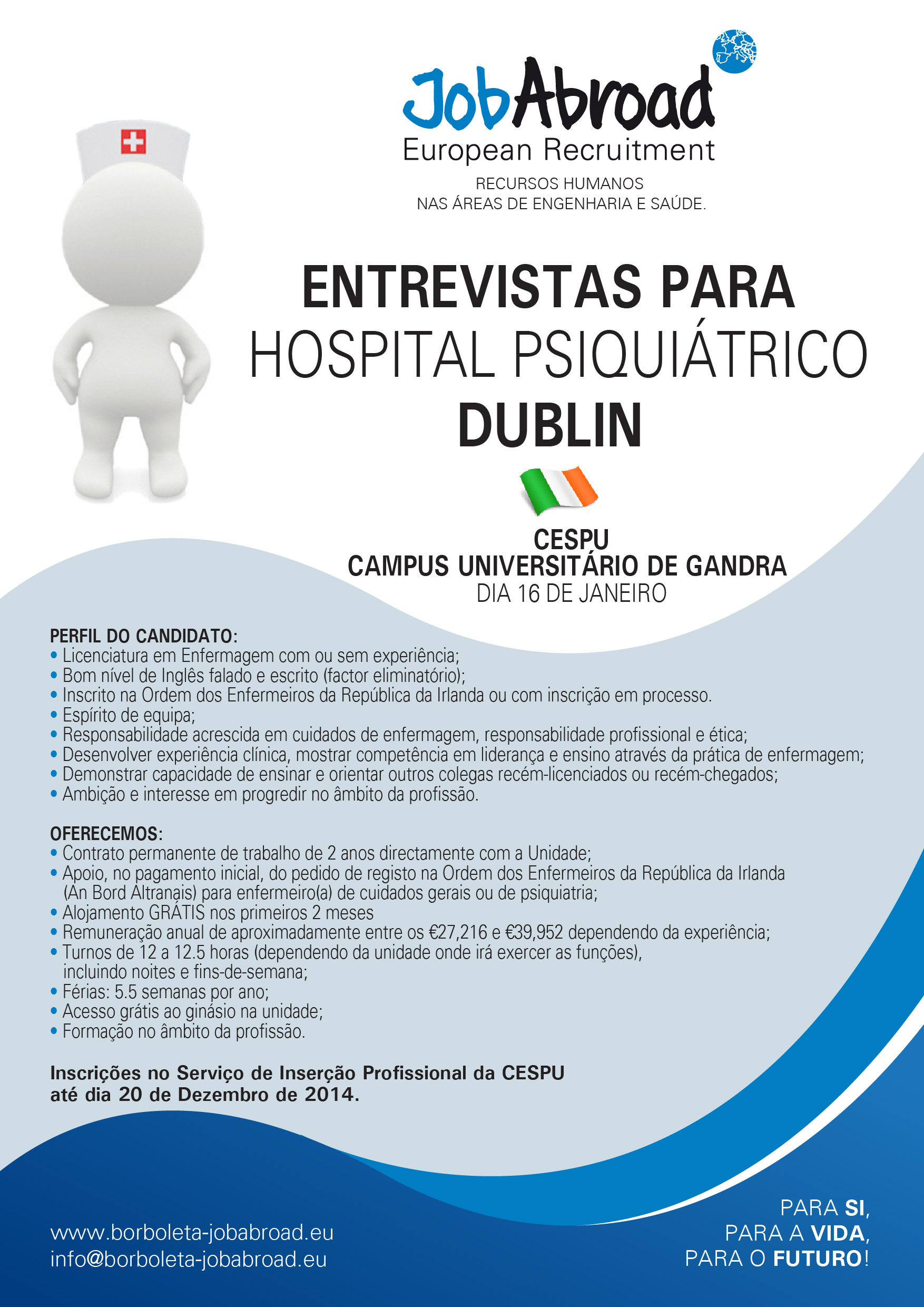 A JobAbroad com a colaboração do Serviço de Inserção Profissional do Departamento de Apoio ao estudante da CESPU, CRL, organizou um evento para recrutamento de profissionais de enfermagem para um Hospital Psiquiátrico situado na República da Irlanda.